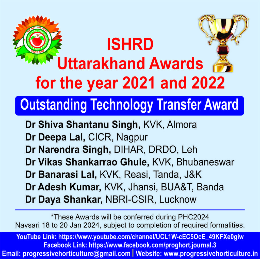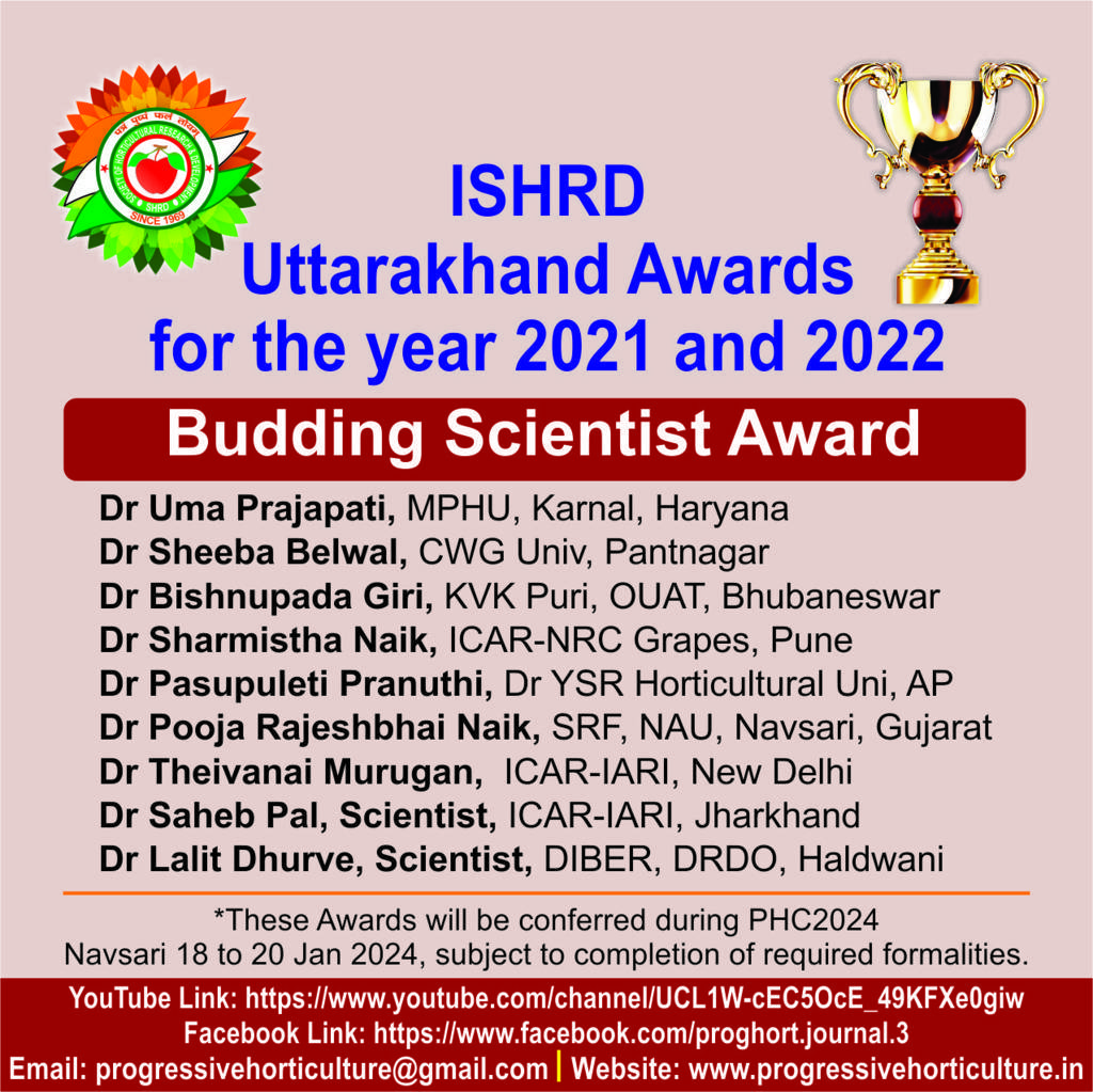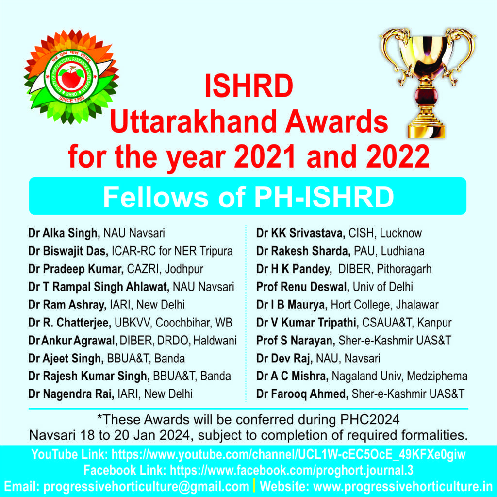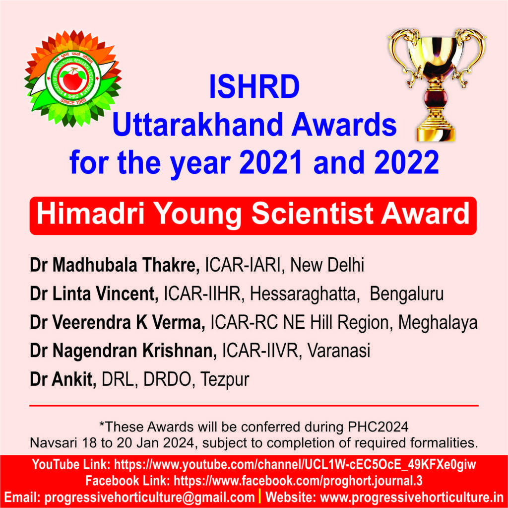 Progressive Horticulture, an official scientific publication of ISHRD, is a peer reviewed journal published since the year 1969. Presently the journal is published twice every year, in the month of June & December. Original contributions covering fundamental and applied research relating to various disciplines of horticultural crops, post harvest management, biotechnology, diversification, policy issues, trade, market
