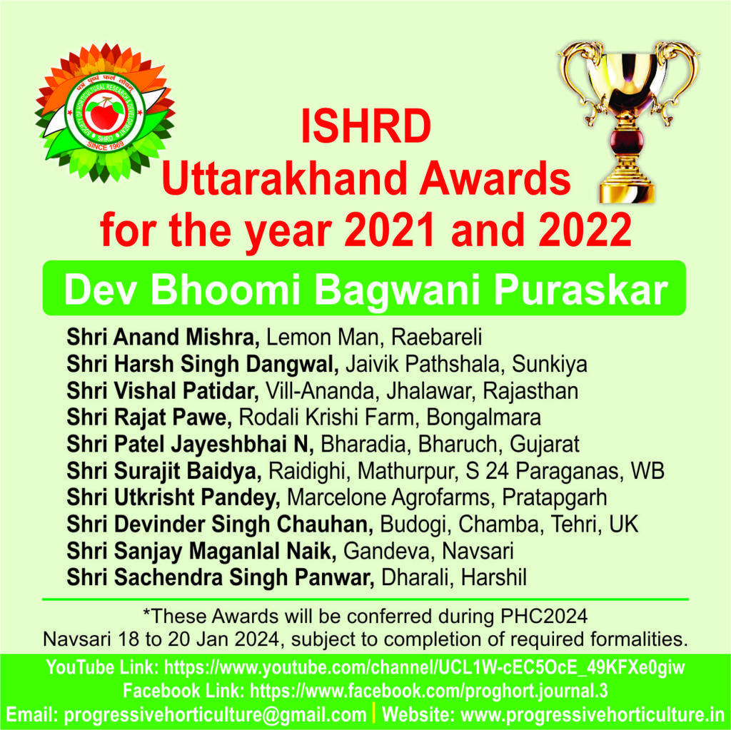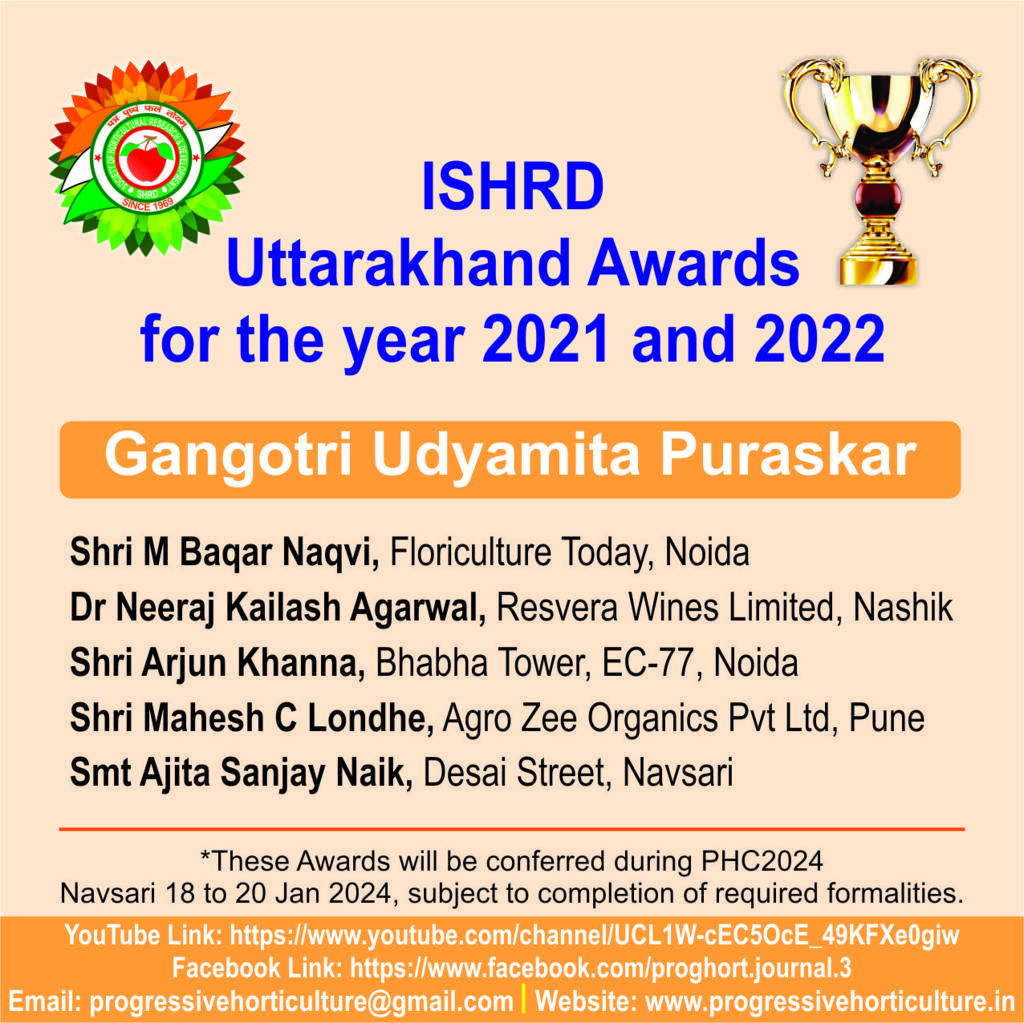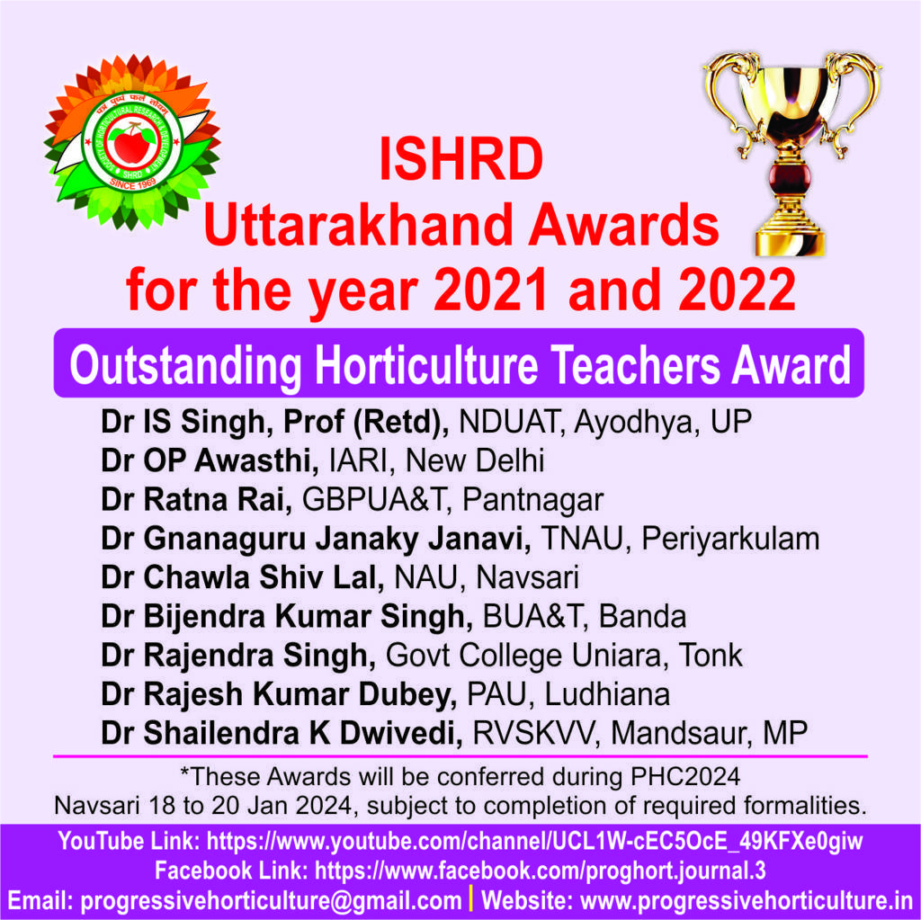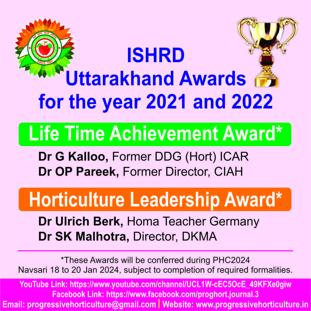 Progressive Horticulture, an official scientific publication of ISHRD, is a peer reviewed journal published since the year 1969. Presently the journal is published twice every year, in the month of June & December. Original contributions covering fundamental and applied research relating to various disciplines of horticultural crops, post harvest management, biotechnology, diversification, policy issues, trade, market